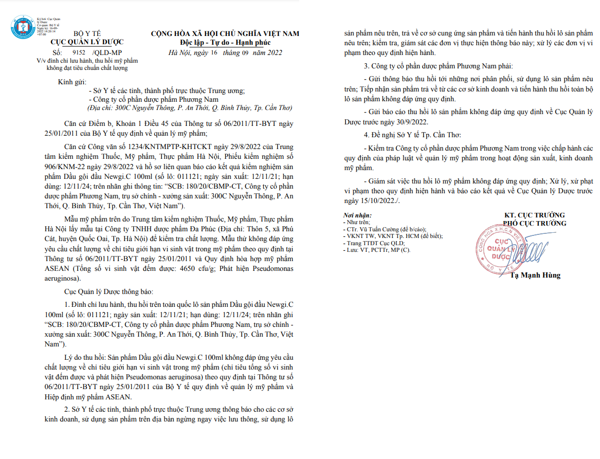 Do đó, Cục Quản lý Dược thông báo đình chỉ lưu hành, thu hồi trên toàn quốc lô sản phẩm Dầu gội đầu Newgi.C 100ml (số lô: 011121; ngày sản xuất: 12/11/21; hạn dùng: 12/11/24; trên nhãn ghi “SCB: 180/20/CBMP-CT, Công ty cổ phần dược phẩm Phương Nam, trụ sở chính - xưởng sản xuất: 300C Nguyễn Thông, P. An Thới, Q. Bình Thủy, TP. Cần Thơ, Việt Nam”).