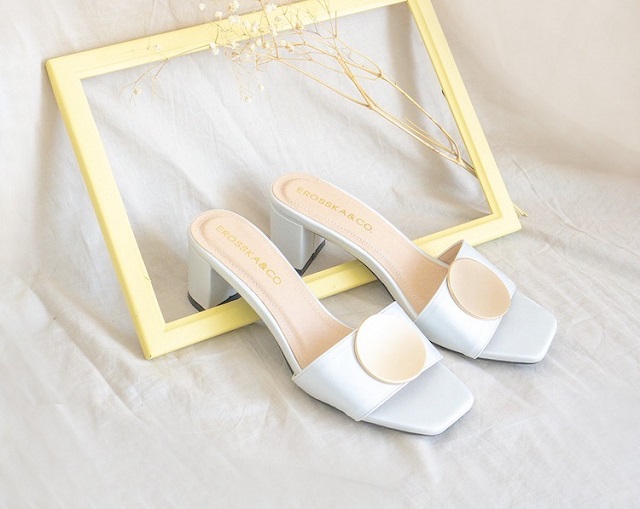 Dép cao gót Erosska EM035 có phần đế cao 5 cm, giúp chị em tôn dáng nhưng vẫn dễ di chuyển nhờ thiết kế phần đế hình khối vuông. Quai dép dạng bản to, được may và dán keo chắc. Sản phẩm có hai màu là trắng và kem, hiện có giá ưu đãi 17% trên Shop VnExpress, giảm còn 249.000 đồng.