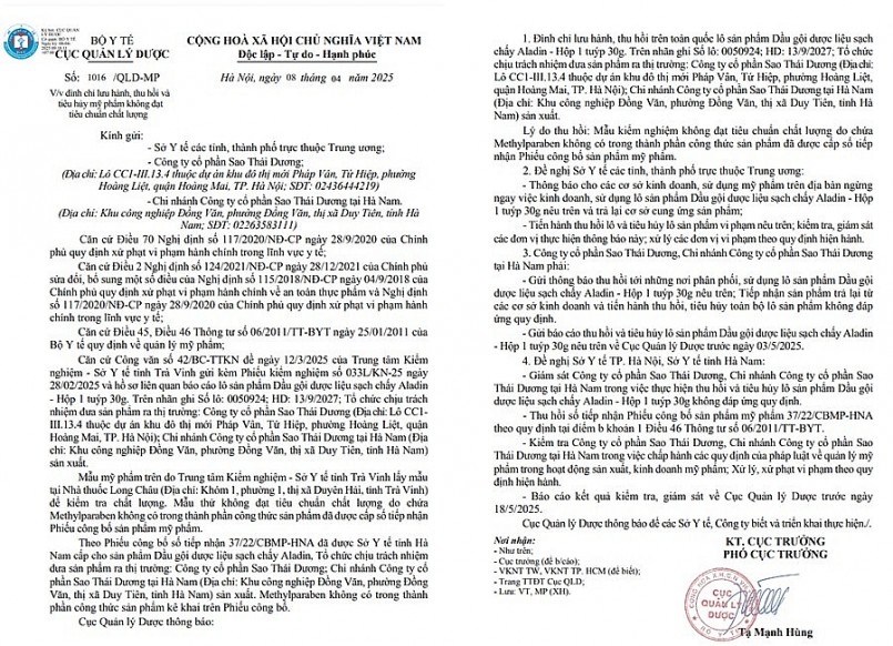 Cục Quản lý Dược cũng nghị Sở Y tế TP. Hà Nội, Sở Y tế tỉnh Hà Nam: - Giám sát Công ty cổ phần Sao Thái Dương, Chi nhánh Công ty cổ phần Sao Thái Dương tại Hà Nam trong việc thực hiện thu hồi và tiêu hủy lô sản phẩm Dầu gội dược liệu sạch chấy Aladin - Hộp 1 tuýp 30g không đáp ứng quy định. - Thu hồi số tiếp nhận Phiếu công bố sản phẩm mỹ phẩm 37/22/CBMP-HNA theo quy định tại điểm b khoản 1 Điều 46 Thông tư số 06/2011/TT-BYT.