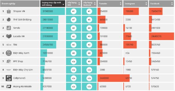 Xếp hạng các trang thương mại điện tử theo lượng truy cập. Ảnh: iPrice Group
