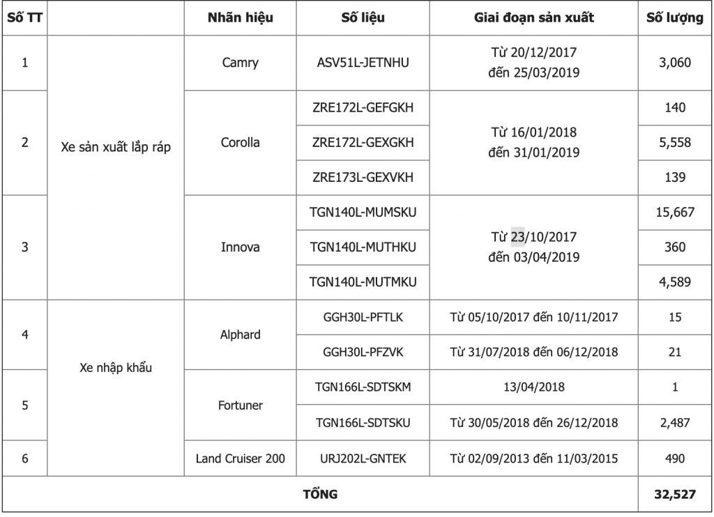 | Các dòng xe và số lượng xe mà Toyota triệu hồi xe tại Việt Nam do lỗi bơm nhiên liệu (nguồn: Toyota) |
