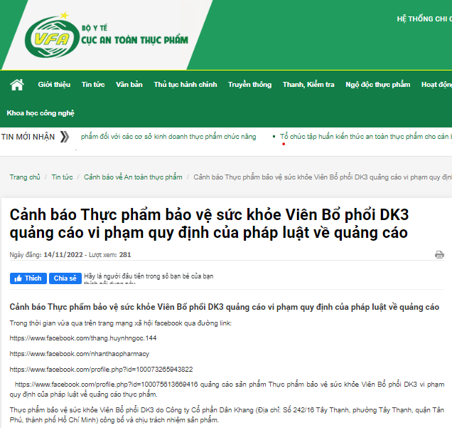 Trong quá trình các cơ quan chức năng xử lý, Cục An toàn thực phẩm đề nghị người tiêu dùng không căn cứ vào các nội dung quảng cáo sai sự thật về sản phẩm Thực phẩm bảo vệ sức khỏe Viên Bổ phổi DK3 tại các trang mạng xã hội tại các đường link nêu trên để quyết định mua và sử dụng sản phẩm vì có nguy cơ gây ảnh hưởng đến sức khỏe và kinh tế.