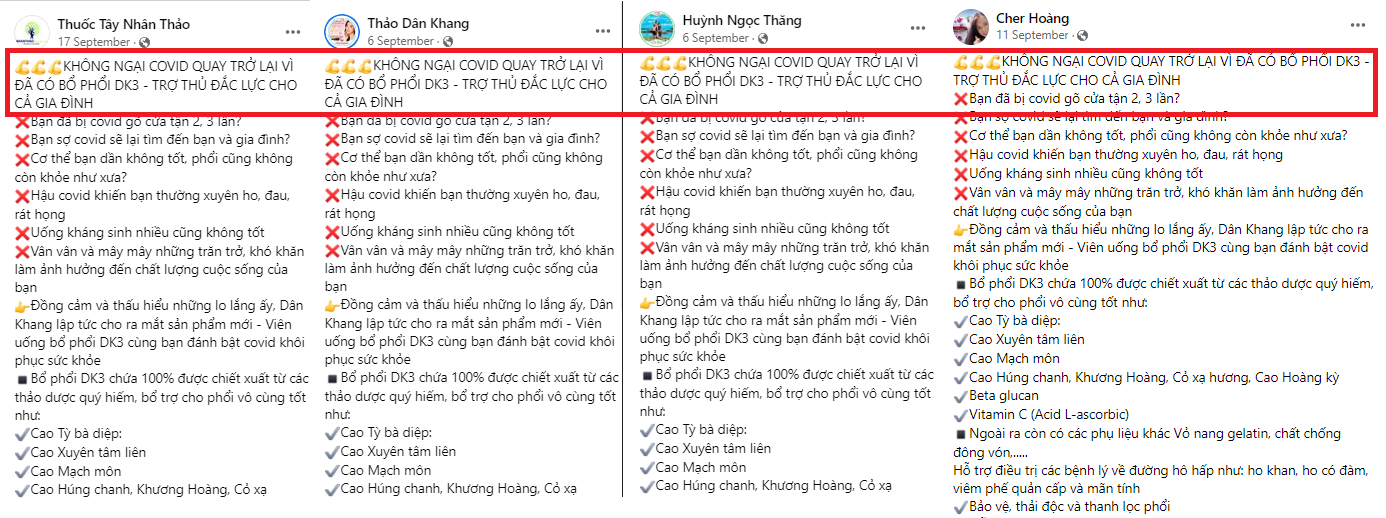 Theo khảo sát của phóng viên, trên các Facebook cá nhân trên, sản phẩm TPBVSK Viên Bổ phổi DK3 được giới thiệu là sản phẩm hết sức ưu việt khi có thể khiến người dùng "không ngại Covid quay lại", như một sản phẩm có khả năng phòng chống Covid, dù công dụng chỉ là "Hỗ trợ điều trị các bệnh lý về đường hô hấp như: ho khan, ho có đàm, viêm phế quản cấp và mãn tính".
