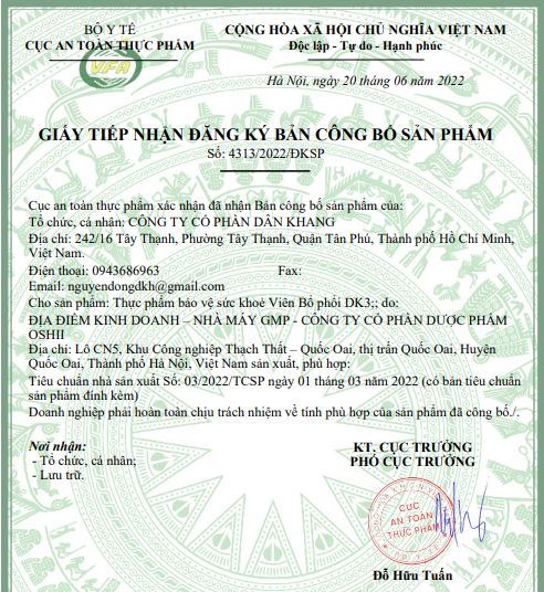 Thực phẩm bảo vệ sức khỏe Viên Bổ phổi DK3 do Công ty Cổ phần Dân Khang (Địa chỉ: Số 242/16 Tây Thạnh, phường Tây Thạnh, quận Tân Phú, thành phố Hồ Chí Minh) công bố và chịu trách nhiệm sản phẩm.