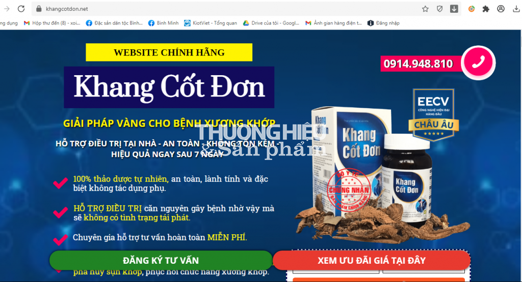 Truy cập http://www.khangcotdon.club/khangcotdonchinhhang2020, trang này “khoa trương”: “Khang Cốt Đơn – Giải pháp hỗ trợ điều trị tận gốc các xương khớp số 1 hiện nay, … là giải pháp hoàn hảo cho bạn… không chỉ tiêu diệt mầm bệnh, sản phẩm còn bình can, bổ thận, khu phong tán hàn, trừ thấp và bổ khí hành huyết…”.