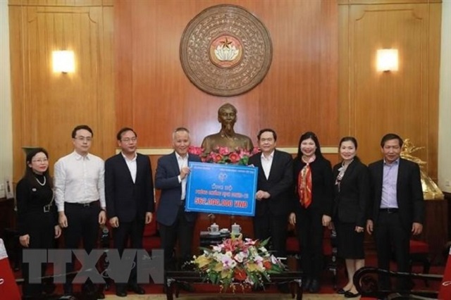 Chủ tịch Ủy ban Trung ương Mặt trận Tổ quốc Việt Nam Trần Thanh Mẫn tiếp nhận ủng hộ của Công ty Honda Việt Nam cùng chung tay phòng, chống dịch COVID-19. (Ảnh: TTXVN phát)