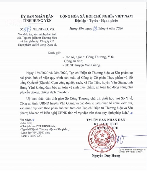 Cụ thể, trong Công văn trên nêu rõ: Ngày 27/4/2020 và ngày 28/4/2020, Tạp chí Điện tử Thương hiệu và Sản phẩm có bài phản ánh về việc quy trình sản xuất tại Công ty cổ phần Thực phẩm và Đồ uống Quốc Tế (Địa chỉ: Cụm công nghiệp sạch, xã Tân Tiến, huyện Văn Giang, tỉnh Hưng Yên) không đảm bảo an toàn vệ sinh thực phẩm, an toàn vệ sinh lao động cũng như yêu cầu phòng, chống dịch Covid-19.