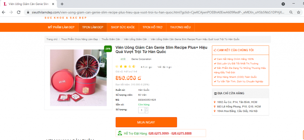 | Dừ chưa đăng ký thông tin tại Cục Ân toàn thực phẩm nhưing sản phẩm Viên Uống Giảm Cân Genie Slim Recipe Plus được các đơn vị bán hàng lớn như shopee, lazada, sendo hết sức rầm rộ. |