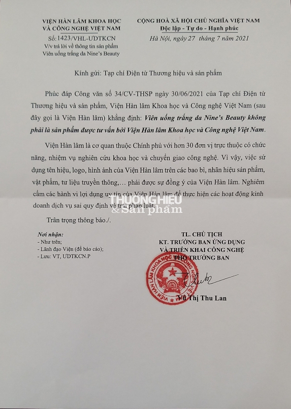 Ngày 30/7/2021 Tạp chí Thương hiệu và Sản phẩm đã nhận được Công văn số 1423/VHL-ƯDTKCN ngày 27/7/2021 của Viện Hàn lâm trả lời thông tin về những nội dung mà Tòa soạn đang có nhu cầu tìm hiểu liên quan đến sản phẩm Viên uống trắng da Nine’s Beauty.