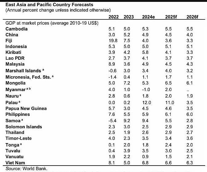 Theo dự báo của WB, trong các quốc gia Đông Á và Thái Bình Dương, Việt Nam có mức dự báo tăng trưởng gần như cao nhất với mức 6,6% năm 2025 và 6,3% năm 2026.