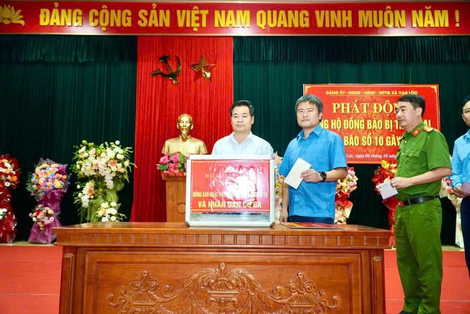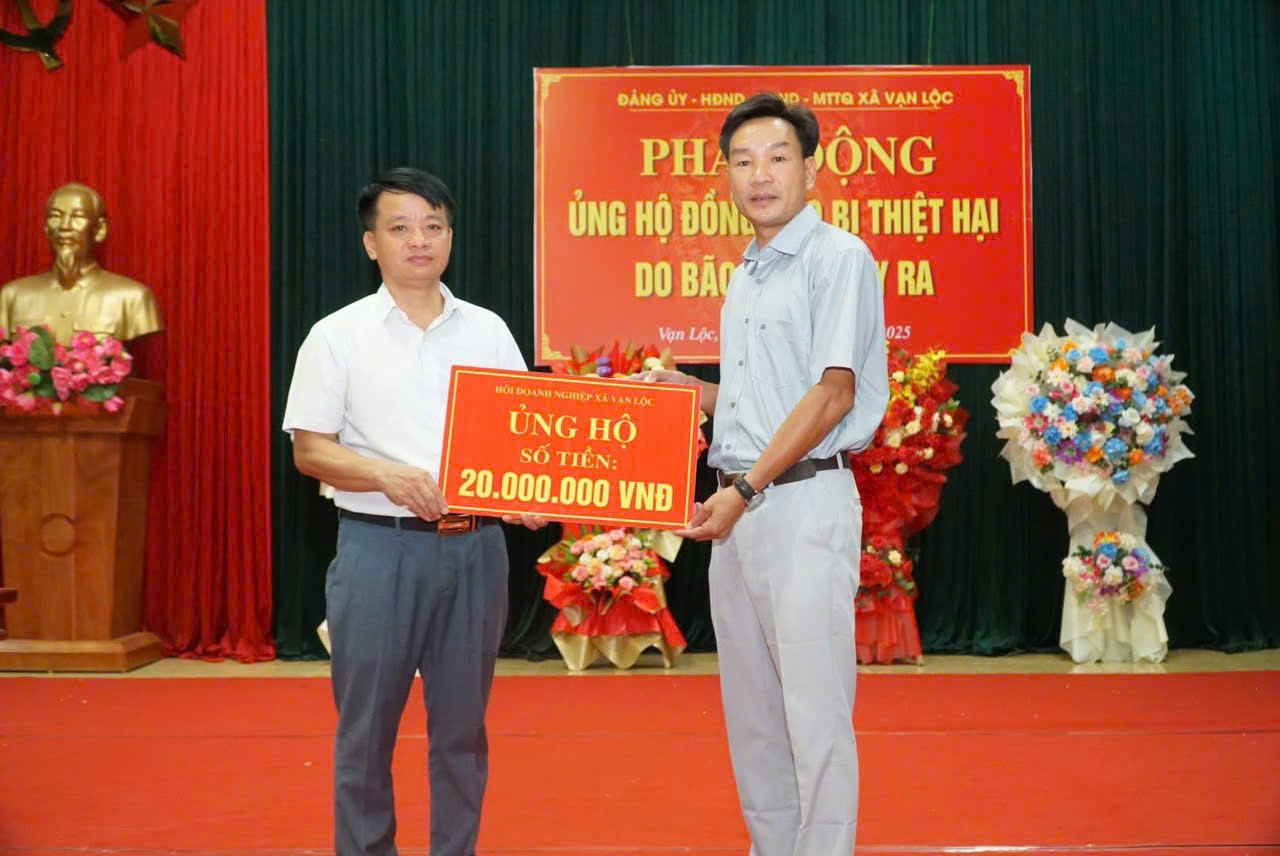 Hội Doanh nghiệp xã Vạn Lộc, do ông Bùi Văn Viết đại diện, đã ủng hộ 20 triệu đồng, mở đầu cho đợt quyên góp với tinh thần “Có ít góp ít, có nhiều góp nhiều”. Cùng với đó, Công ty TNHH Vận tải và Du lịch Minh Quý cũng tích cực tham gia, đồng thời kêu gọi toàn thể cán bộ, công nhân viên của công ty cùng chung tay ủng hộ, góp phần lan tỏa tinh thần tương thân tương ái, chia sẻ khó khăn với đồng bào vùng bão lũ,Không khí buổi lễ diễn ra trang trọng, ấm áp, lan tỏa tinh thần trách nhiệm cộng đồng và nghĩa tình quê hương.