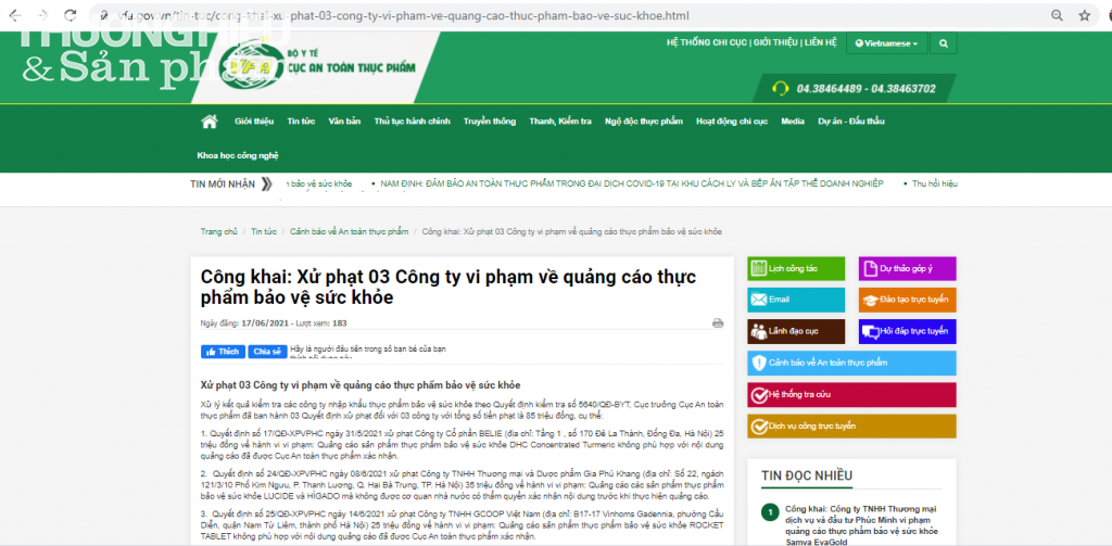 1. Quyết định số 17/QĐ-XPVPHC ngày 31/5/2021 xử phạt Công ty Cổ phần BELIE (địa chỉ: Tầng 1 , số 170 Đê La Thành, Đống Đa, Hà Nội) 25 triệu đồng về hành vi vi phạm: Quảng cáo sản phẩm thực phẩm bảo vệ sức khỏe DHC Concentrated Turmeric không phù hợp với nội dung quảng cáo đã được Cục An toàn thực phẩm xác nhận.